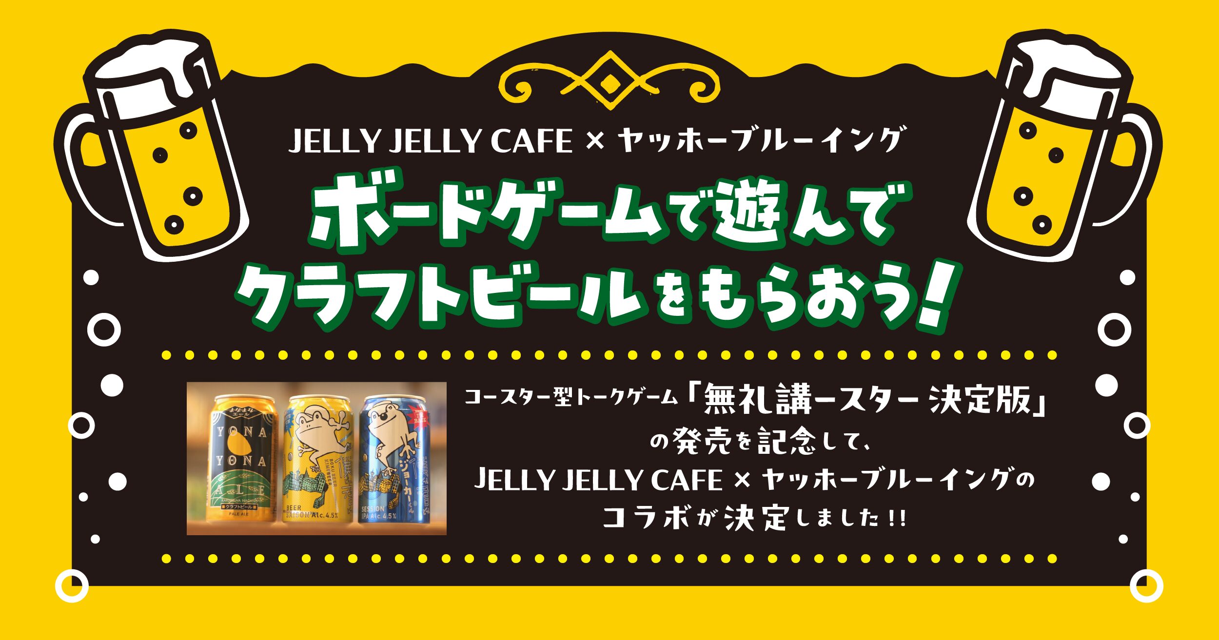 JELLY JELLY CAFEで、飲み会専用パーティーゲーム『無礼講ースター』を遊んで、その様子をSNSに投稿してくださったお客様に、ヤッホーブルーイングのクラフトビールを1本プレゼントいたします!