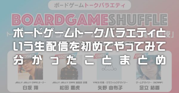 ボードゲームコラム ボードゲームトークバラエティという生配信を初めてやってみて分かったことまとめ 2016.7.19 白坂翔 遊んだ人の内面まで見えてくるおもしろゲーム5選 2016.6.22 スターミー TRPGとボードゲームは意外と似てる? TRPGプレイヤー向けボードゲーム5選! 2016.5.25 ふかつ バラエティ番組を参考にボードゲームプレイ動画を編集してみて分かったこと 2016.5.24 白坂翔 燃やせ脂肪!ボードゲームで痩せる「ボドゲダイエット」 2016.5.22 ふかつ スマホでも楽しめる!ボードゲームアプリ10選 2016.5.21 たかとら ゲームマーケットで新しくラインナップに追加したボードゲーム紹介! 2016.5.20 あらい 渋谷MODI「タイムマート」にて、ボードゲーム・カードゲームフェア開催中! 2016.5.17 がくぶち 【接着剤不要!】A4用紙1枚だけでカードホルダー作ってみた【PDFファイル配布】 2016.5.11 がくぶち 新機能「絞り込み検索」追加でボードゲーム検索がパワーアップしました! 2016.5.2 白坂翔 JELLY JELLY CAFE 渋谷店に広辞林がある理由とは…? 2016.4.28 がくぶち ヒルナンデスで紹介されたボードゲームまとめ 2016.4.14 がくぶち 1112131415