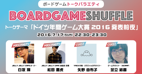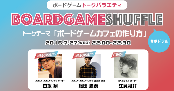 お知らせ AbemaTV「インストのススメ」8月2日(火)18時より生放送! #ボドフル 2016.7.29 白坂翔 2016年お盆料金について 2016.7.22 たかとら 【Pokémon GO日本公開記念】本日19時より1時間、ポケモンゲットキャンペーン開催! 2016.7.22 白坂翔 夏休みは学割でお得に遊ぼう! 2016.7.21 たかとら 【福岡天神店限定】茜霧島、はじめました。(ボトルキープも可) 2016.7.20 なかがわ AbemaTV「ボードゲームカフェの作り方」7月27日(水)22時より生配信! 2016.7.20 白坂翔 【本日生配信】AbemaTV内「UCHIDA TV」で JELLY JELLY CAFE下北沢店が紹介されます! 2016.7.20 酒井りゅうのすけ 【本日放送】テレビ西日本「みんなのニュース」で JELLY JELLY CAFE福岡天神店が紹介されます! 2016.7.20 なかがわ 「九州スポーツ」で JELLY JELLY CAFE福岡天神店が紹介されました! 2016.7.19 なかがわ 【生配信】AbemaTVでボードゲームトークバラエティはじめます! 2016.7.14 白坂翔 【本日放送】RKB毎日放送「今日感テレビ」で JELLY JELLY CAFE福岡天神店が紹介されます! 2016.7.8 なかがわ 下北沢店でもお席のご予約が出来るようになりました! 2016.7.6 酒井りゅうのすけ 5657585960