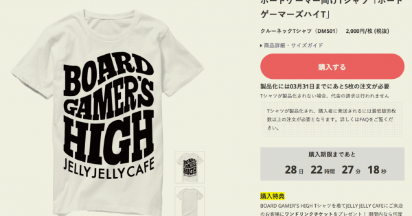 お知らせ 新機能「絞り込み検索」追加でボードゲーム検索がパワーアップしました! 2016.5.2 白坂翔 JELLY JELLY CAFEはゴールデンウィークも休まず営業します! 2016.4.29 たかとら 中高校生もおトクに遊べる!「中高生割」はじめます! 2016.4.19 たかとら フリーマガジン「大江戸リビング」にJELLY JELLY CAFEが掲載されました! 2016.4.19 がくぶち 【4月13日(水)放送】日本テレビ「ヒルナンデス」でJELLY JELLY CAFE渋谷店が紹介されます!(予定) 2016.4.12 白坂翔 「平日重ゲー会」毎週木曜日に開催決定! 2016.4.8 たかとら ニコニコ本社街頭ビジョンで池袋店のプロモーション動画が放送中です! 2016.3.25 たかとら 【3月26日放送予定】J-WAVE「ラジオドーナツ」に出演します! 2016.3.25 白坂翔 東京ウォーカー4月号に池袋店が掲載されました! 2016.3.23 たかとら 渋谷店の机をリニューアルいたしました! 2016.3.22 白坂翔 オリジナルTシャツ販売サイト「STEERS」でボードゲーマー向けTシャツ販売スタートいたしました! 2016.3.3 白坂翔 【情報随時更新】全国版ボードゲームスペースMAPを作成しました!! 2016.2.24 ヨジー 5859606162
