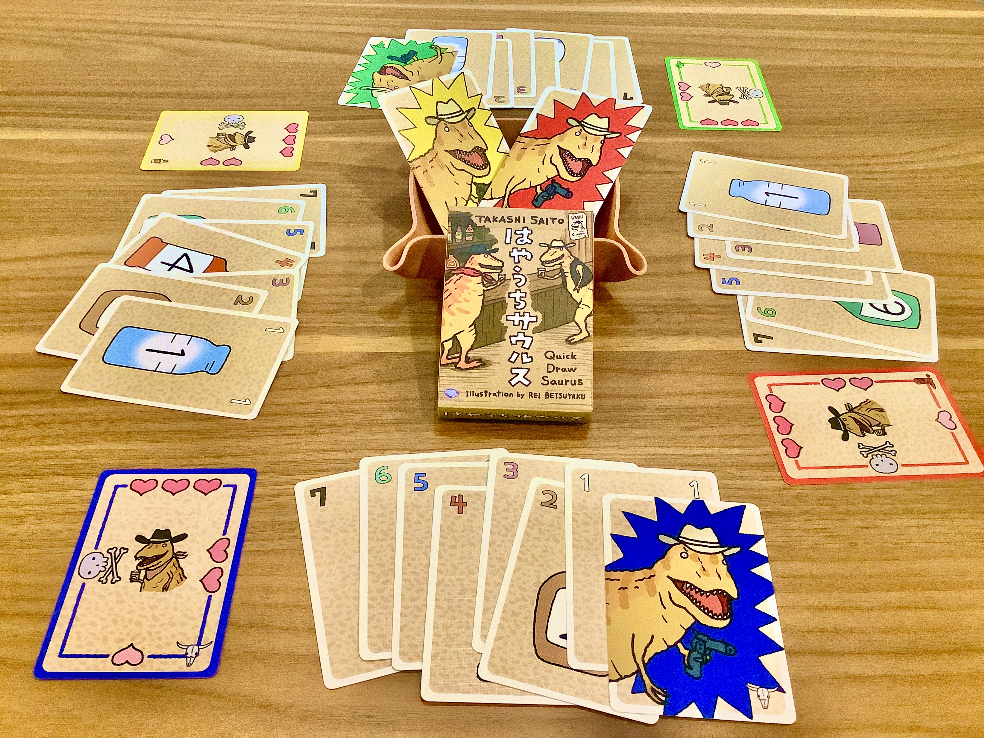 プレイヤーは手札から1枚お酒カードを選び一斉に公開します。1番弱いお酒を出した恐竜はハートを失います。自分と同じお酒を飲もうとしている恐竜がいたら、銃カードをすばやくテーブル中央に出して威嚇しましょう。