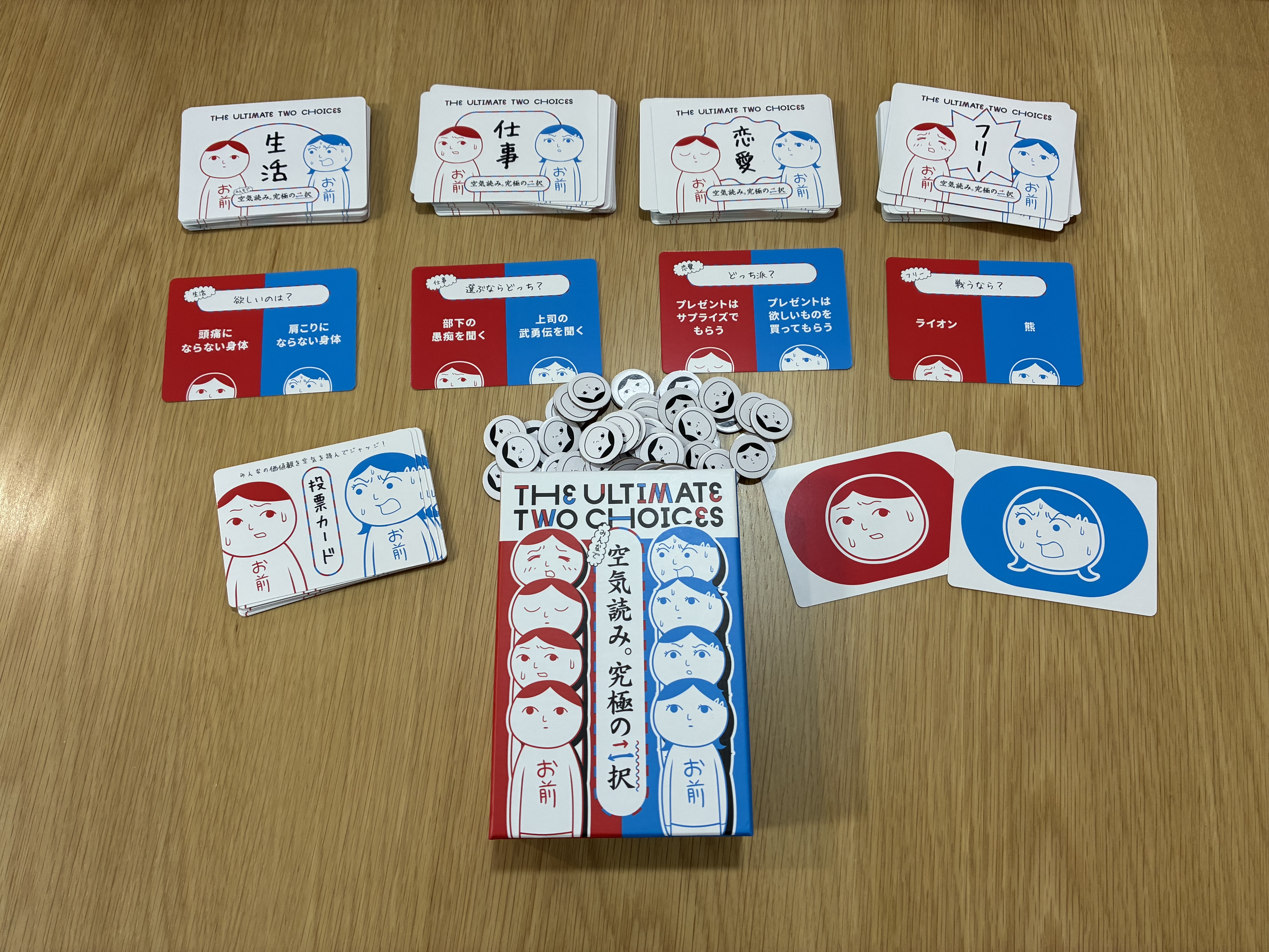 お題カードに書かれている2択のうち、親プレイヤーがどちらを選んだのかを当てる空気読みゲームです。