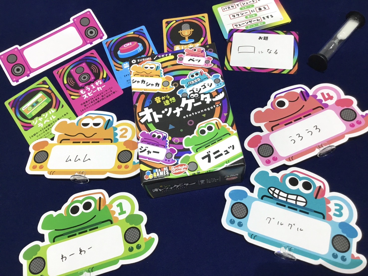 お題カードで指定されたお題を表す擬音を、手分けして1~6のタイルに時系列で書く(例えば「歯磨き」がお題だったら「ブニュッ」「ニュム」「ゴシゴシ」「シャカシャカ」「ペッ」)。親はその並びを見てお題を当てます。回答権は3回で当たらなかったら「ジャンル」「もう1枚」「並べ替え」「声に出す」で追加ヒントを出すことができます。親を交代して7問行い、正解数に応じて成績を出します。