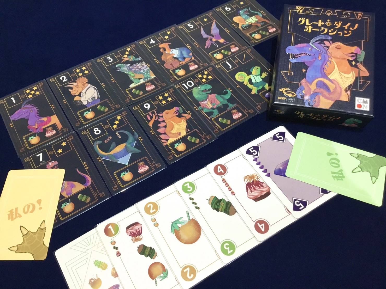 プレイヤーはパーティーの主催者として、恐竜たちをゲストに招くためにオークション(競り)で競い合います。恐竜の好みに合った「嗜好品カード」や、どの恐竜にも使える「宝石カード」を使って、より高い数字で入札し競り落としましょう。ゲーム終了時、獲得した恐竜カードに記された★の数やカードのセットから得点を得て、一番得点が多いプレイヤーが勝利します。