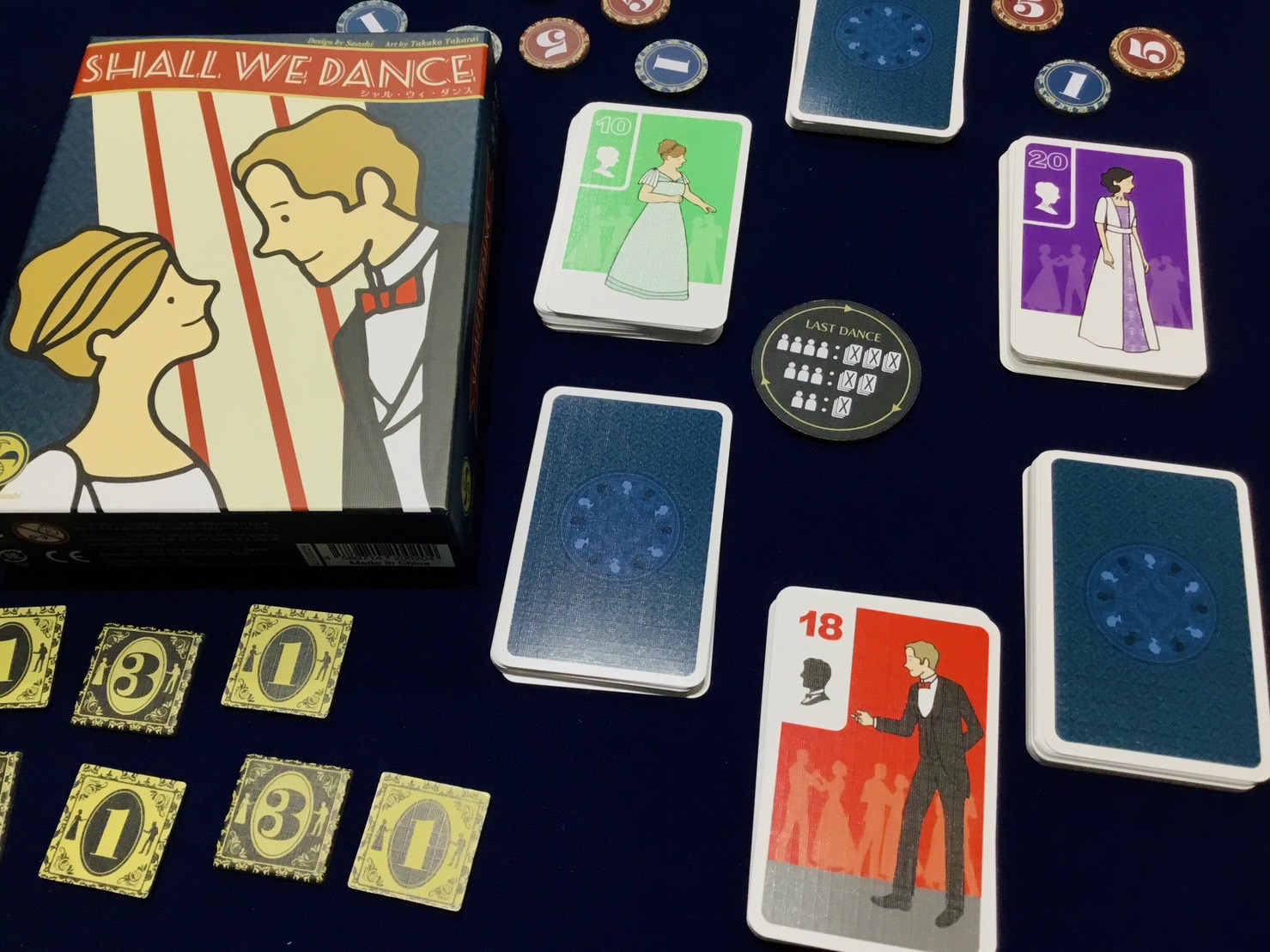 今宵は紳士と淑女が集う舞踏会。彼らはダンスのペアを組む相手を探しています。自分のカードの出し方次第で、ペアを組んでいない紳士淑女をよそのダンスエリアから招くこともできますが、招いた相手の得点にもなってしまいます。ときには逆に相手を求めて自分のダンスエリアを離れて行ってしまう場合もあります。ゲーム終了時には成立したペアの数と、色ごとの紳士淑女の数の順位に応じた得点などを得ます。