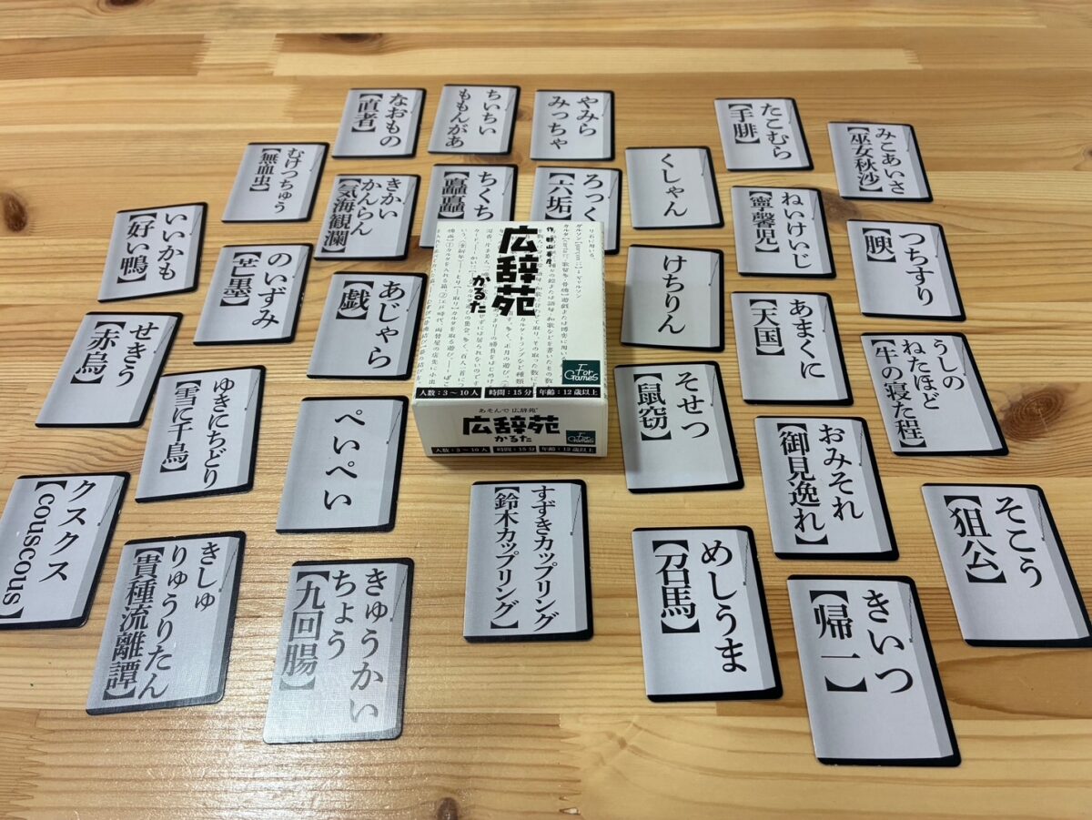 広辞苑に載っている言葉を使ってカルタをしましょう 1人が読み札を読み上げ、他の人はそれに合った取り札を一早く取ります。沢山正解できた人の勝ちです!! 広辞苑に載っている言葉は約250000項目!まだ見ぬ言葉を見つけましょう!!